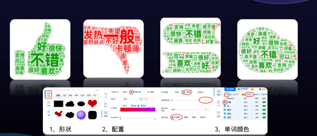 上传后,工具会自动识别并处理数据,可以生成正面词云图、负面词云图以及包含正面和负面词汇的整体词云图,从图中可以直观地了解整体的情感倾向。