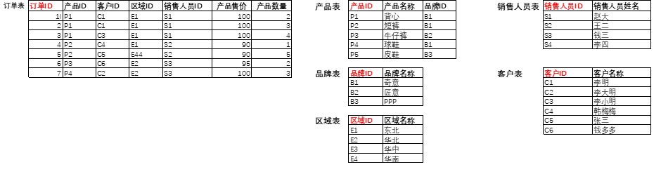 在业务数据表中,订单表通常包含订单的基本信息,例如订单ID、客户ID、产品ID等。而品牌表则包含品牌的基本信息,例如品牌ID、品牌名称等。